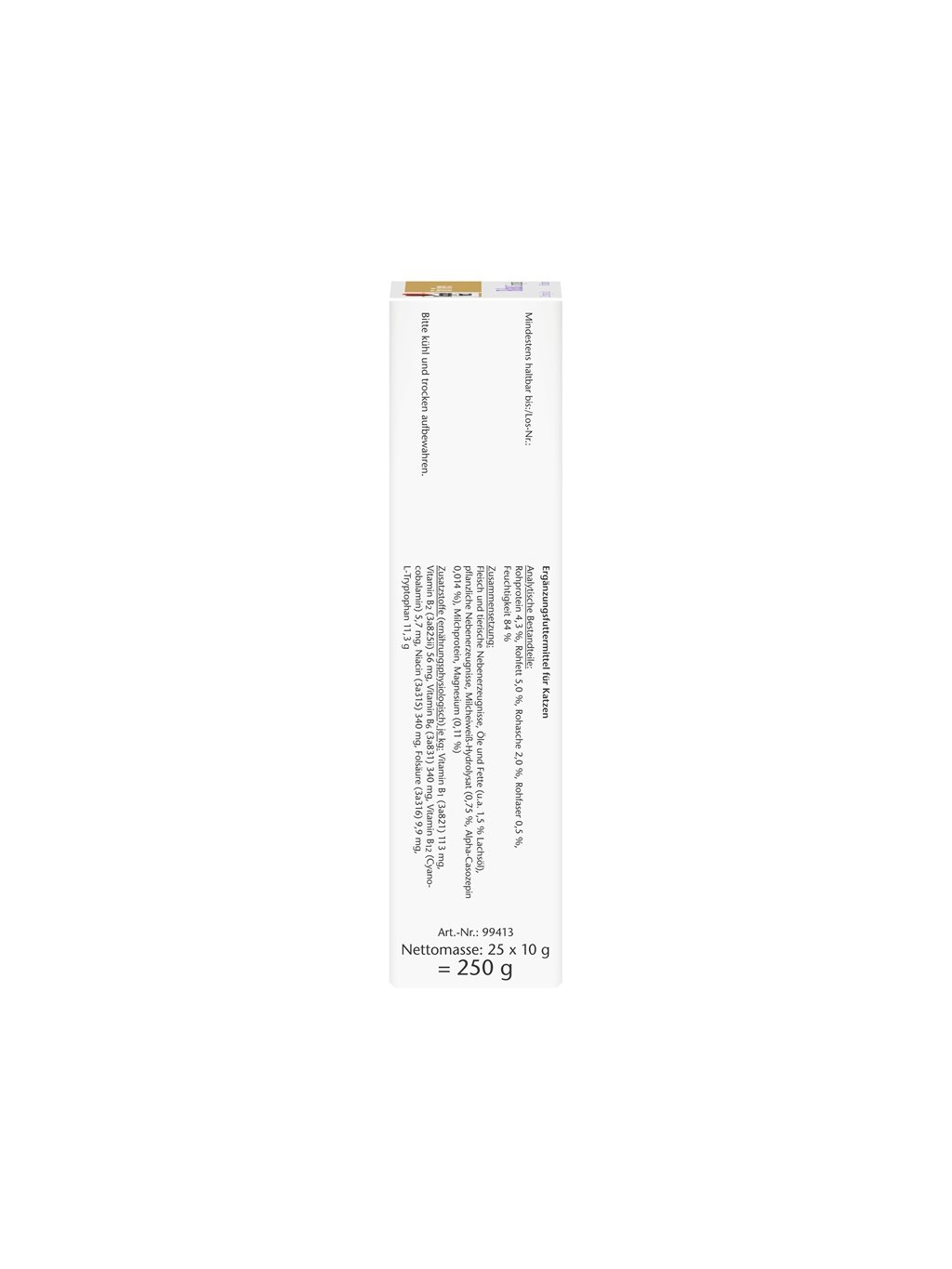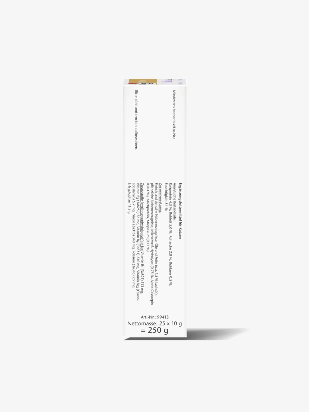Vitamín B1 (3a821) 113 mg, Vitamín B2 (3a825ii) 56 mg, Vitamín B6 (3a831) 340 mg, Vitamín B12 (kyanokobalamin) 5,7 mg, Niacin (3a315) 340 mg, Kyselina listová (3a316) 9,9 mg, L-tryptofan 11,3 mg g